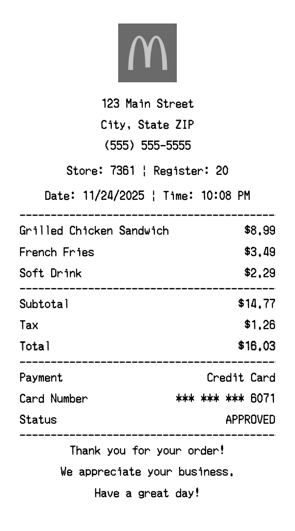 Our McDonald's receipt generator creates professional receipts that match the authentic McDonald's format. Each receipt includes the company logo, business information, transaction details, itemized purchase list, tax calculations, and payment information. All receipts are formatted to look exactly like real McDonald's receipts, making them perfect for expense reports, tax documentation, and reimbursement purposes.