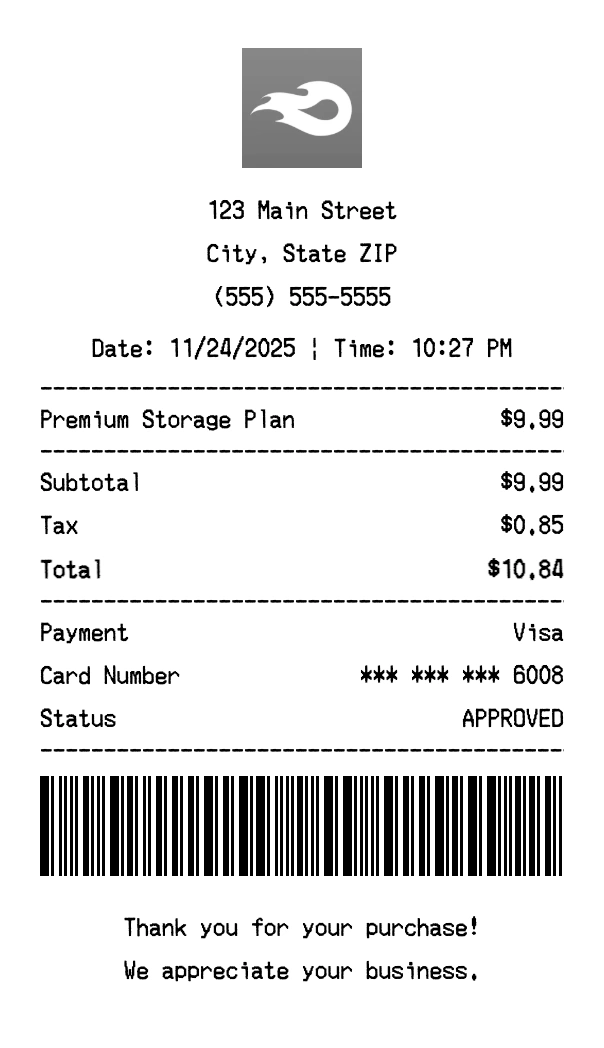 Create authentic MediaFire receipts instantly. Our free receipt generator produces professional cloud storage receipts with company logo, itemized purchases, tax calculations, and payment details. Perfect for expense tracking, reimbursement, and documentation. Download high-quality PNG receipts in seconds.