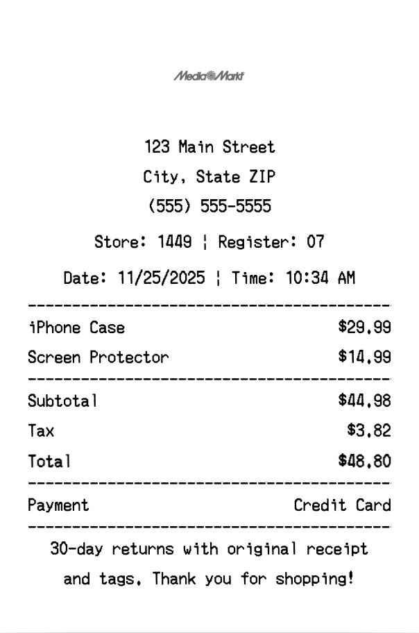 Create authentic MediaMarkt receipts for electronics retail purchases. Our free receipt generator tool helps you create professional, detailed receipts instantly. Perfect for business expense tracking, reimbursement requests, and personal documentation. Download high-quality PNG receipts in seconds, no signup required.