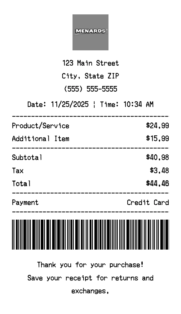 Create authentic Menards receipts for home improvement purchases. Our free receipt generator tool helps you create professional, detailed receipts instantly. Perfect for business expense tracking, reimbursement requests, and personal documentation. Download high-quality PNG receipts in seconds, no signup required.