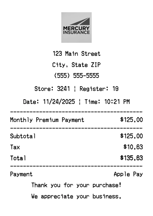 Create authentic Mercury Insurance receipts instantly. Our free receipt generator produces professional insurance receipts with company logo, itemized purchases, tax calculations, and payment details. Perfect for expense tracking, reimbursement, and documentation. Download high-quality PNG receipts in seconds.