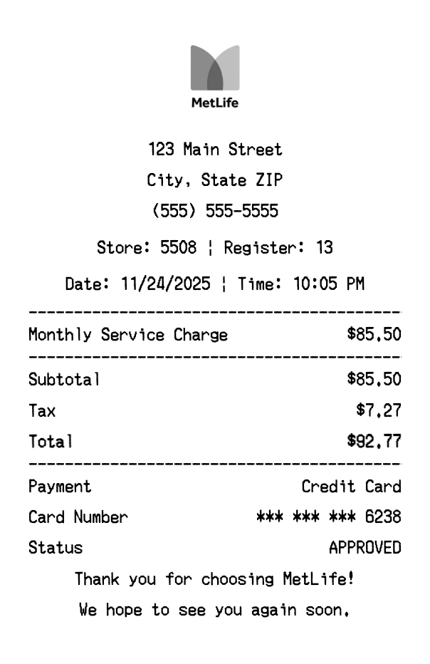 Create authentic MetLife receipts for financial services purchases. Our free receipt generator tool helps you create professional, detailed receipts instantly. Perfect for business expense tracking, reimbursement requests, and personal documentation. Download high-quality PNG receipts in seconds, no signup required.