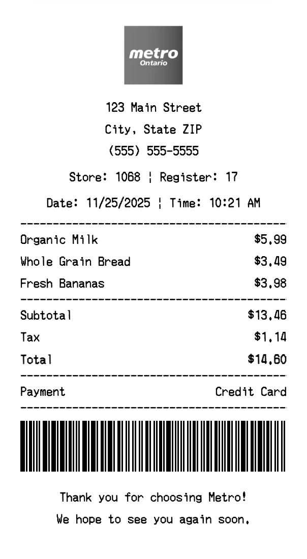 Create authentic Metro receipts for grocery store purchases. Our free receipt generator tool helps you create professional, detailed receipts instantly. Perfect for business expense tracking, reimbursement requests, and personal documentation. Download high-quality PNG receipts in seconds, no signup required.