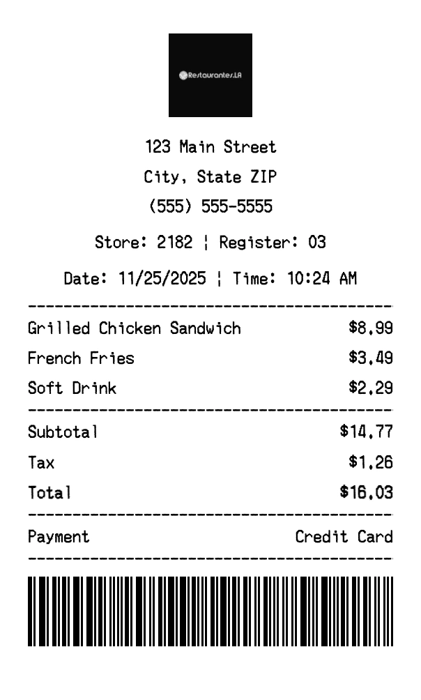 Create authentic Mexican Restaurants receipts instantly. Our free receipt generator produces professional restaurant group receipts with company logo, itemized purchases, tax calculations, and payment details. Perfect for expense tracking, reimbursement, and documentation. Download high-quality PNG receipts in seconds.