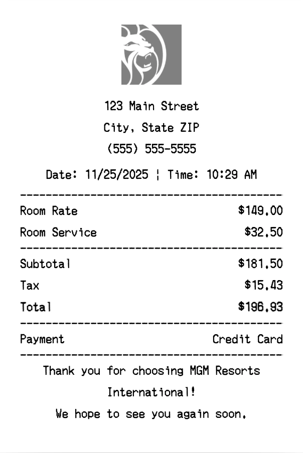 Create authentic MGM Resorts International receipts instantly. Our free receipt generator produces professional hotels receipts with company logo, itemized purchases, tax calculations, and payment details. Perfect for expense tracking, reimbursement, and documentation. Download high-quality PNG receipts in seconds.