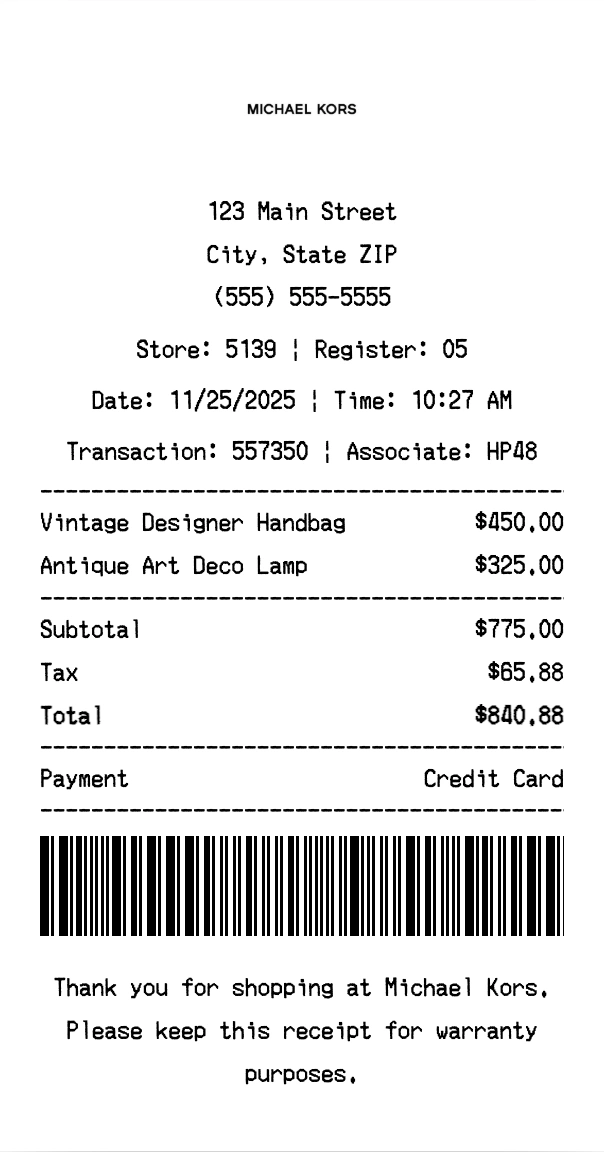 Create authentic Michael Kors receipts for luxury fashion purchases. Our free receipt generator tool helps you create professional, detailed receipts instantly. Perfect for business expense tracking, reimbursement requests, and personal documentation. Download high-quality PNG receipts in seconds, no signup required.