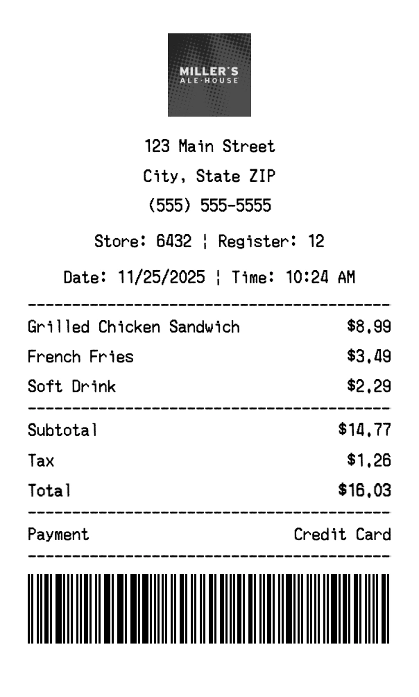 Create authentic Miller's Ale House receipts for casual dining purchases. Our free receipt generator tool helps you create professional, detailed receipts instantly. Perfect for business expense tracking, reimbursement requests, and personal documentation. Download high-quality PNG receipts in seconds, no signup required.