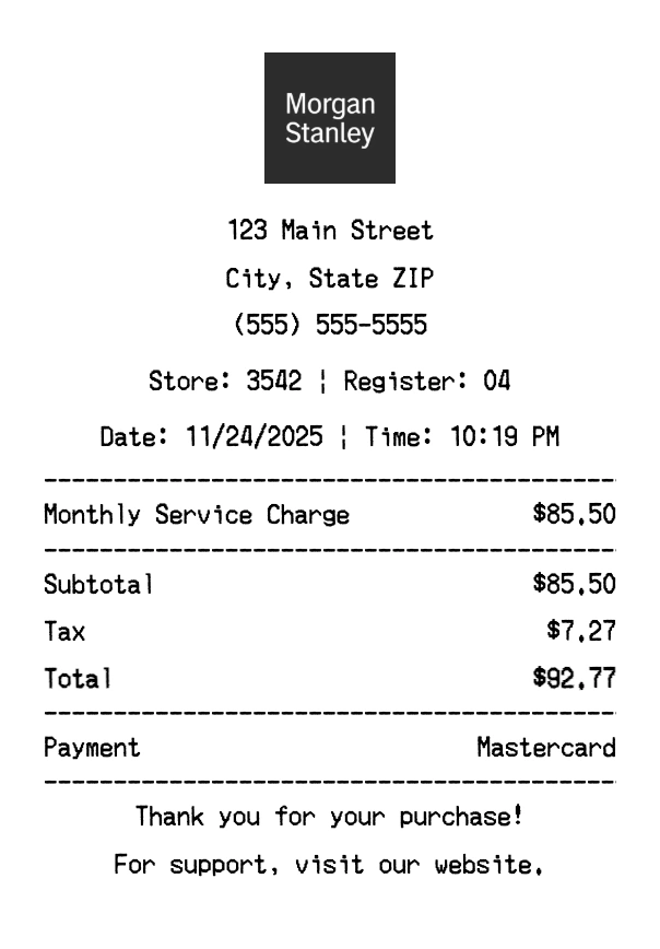 Create authentic Morgan Stanley receipts instantly. Our free receipt generator produces professional financial services receipts with company logo, itemized purchases, tax calculations, and payment details. Perfect for expense tracking, reimbursement, and documentation. Download high-quality PNG receipts in seconds.