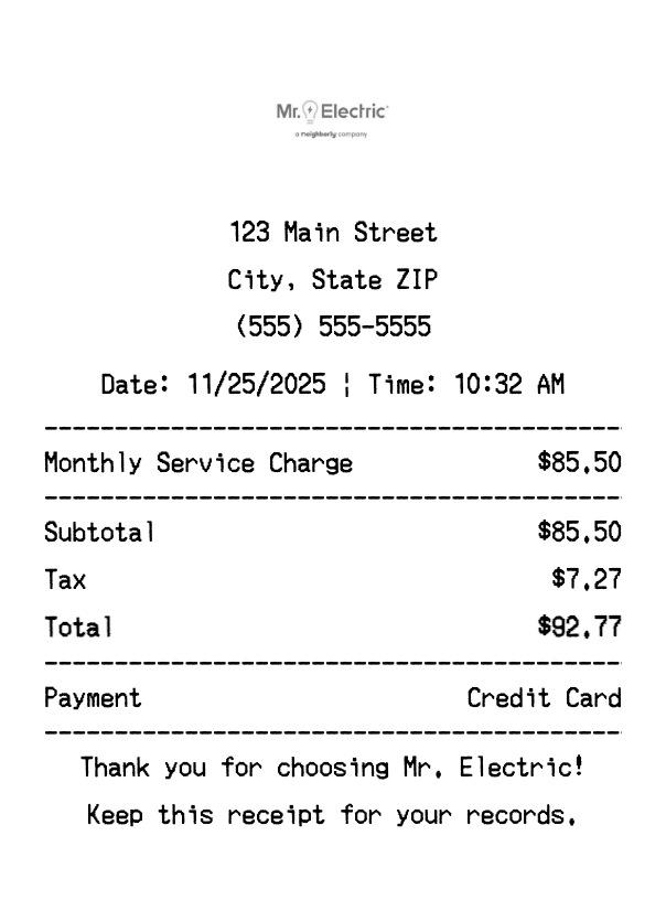 Create authentic Mr. Electric receipts for electrical services purchases. Our free receipt generator tool helps you create professional, detailed receipts instantly. Perfect for business expense tracking, reimbursement requests, and personal documentation. Download high-quality PNG receipts in seconds, no signup required.