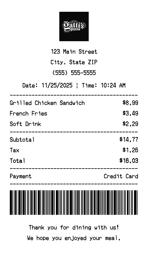 Create authentic Mr. Gatti's Pizza receipts for fast food purchases. Our free receipt generator tool helps you create professional, detailed receipts instantly. Perfect for business expense tracking, reimbursement requests, and personal documentation. Download high-quality PNG receipts in seconds, no signup required.