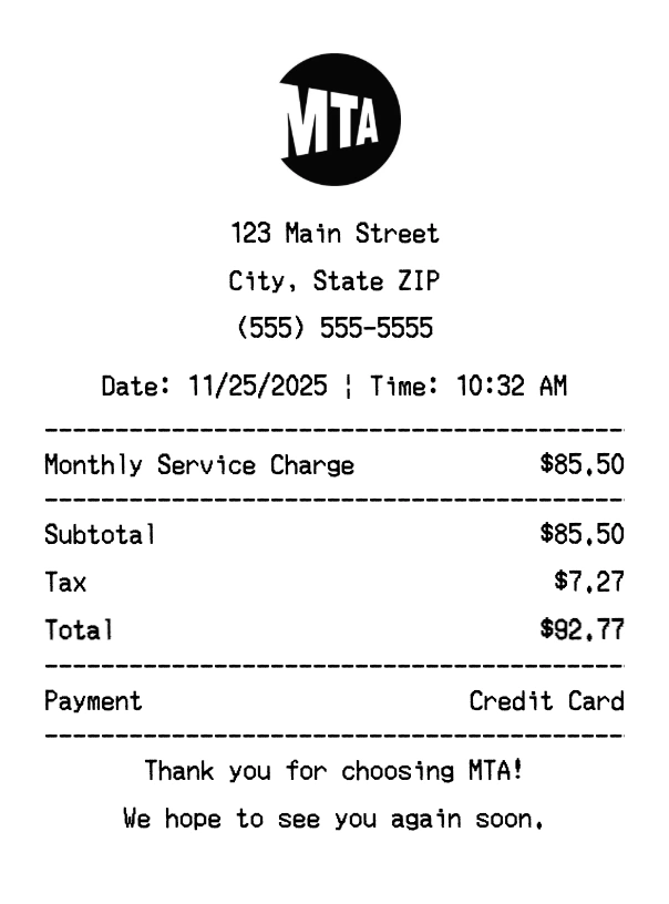 Create authentic MTA receipts instantly. Our free receipt generator produces professional public transit receipts with company logo, itemized purchases, tax calculations, and payment details. Perfect for expense tracking, reimbursement, and documentation. Download high-quality PNG receipts in seconds.