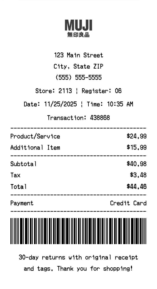 Create authentic Muji receipts instantly - including Muji USA purchases. Our free receipt generator produces professional home goods receipts with company logo, itemized purchases, tax calculations, and payment details. Perfect for expense tracking, reimbursement, and documentation. Download high-quality PNG receipts in seconds.