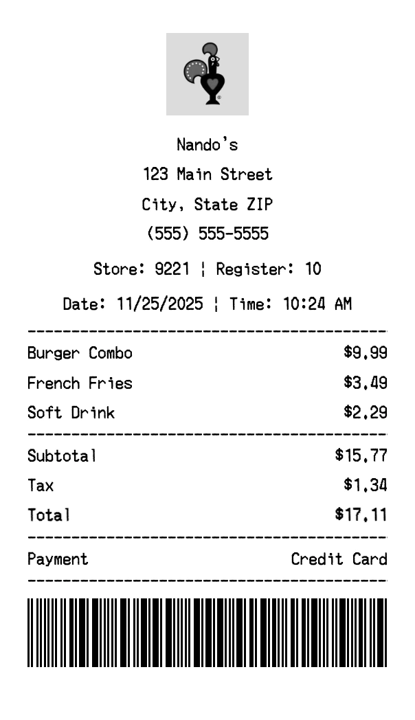 Create authentic Nando's receipts for fast casual purchases. Our free receipt generator tool helps you create professional, detailed receipts instantly. Perfect for business expense tracking, reimbursement requests, and personal documentation. Download high-quality PNG receipts in seconds, no signup required.