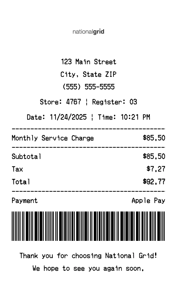 Create authentic National Grid receipts instantly. Our free receipt generator produces professional energy receipts with company logo, itemized purchases, tax calculations, and payment details. Perfect for expense tracking, reimbursement, and documentation. Download high-quality PNG receipts in seconds.