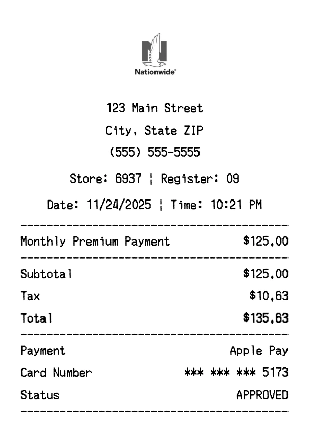 Create authentic Nationwide receipts for insurance purchases. Our free receipt generator tool helps you create professional, detailed receipts instantly. Perfect for business expense tracking, reimbursement requests, and personal documentation. Download high-quality PNG receipts in seconds, no signup required.