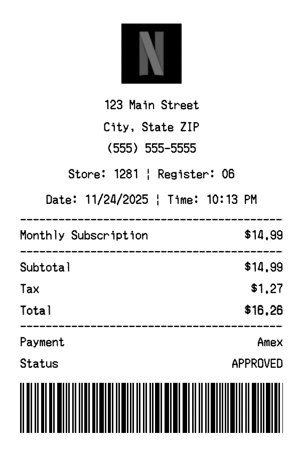 Create authentic Netflix receipts instantly. Our free receipt generator produces professional streaming receipts with company logo, itemized purchases, tax calculations, and payment details. Perfect for expense tracking, reimbursement, and documentation. Download high-quality PNG receipts in seconds.