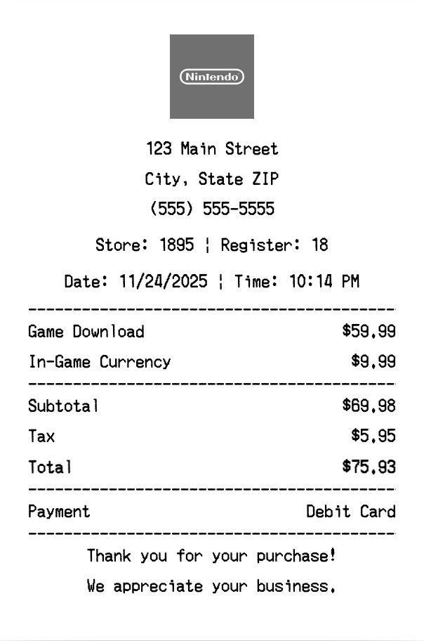 Create authentic Nintendo receipts for gaming purchases. Our free receipt generator tool helps you create professional, detailed receipts instantly. Perfect for business expense tracking, reimbursement requests, and personal documentation. Download high-quality PNG receipts in seconds, no signup required.