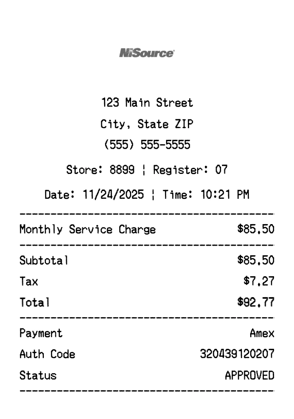 Create authentic NiSource receipts instantly. Our free receipt generator produces professional energy receipts with company logo, itemized purchases, tax calculations, and payment details. Perfect for expense tracking, reimbursement, and documentation. Download high-quality PNG receipts in seconds.