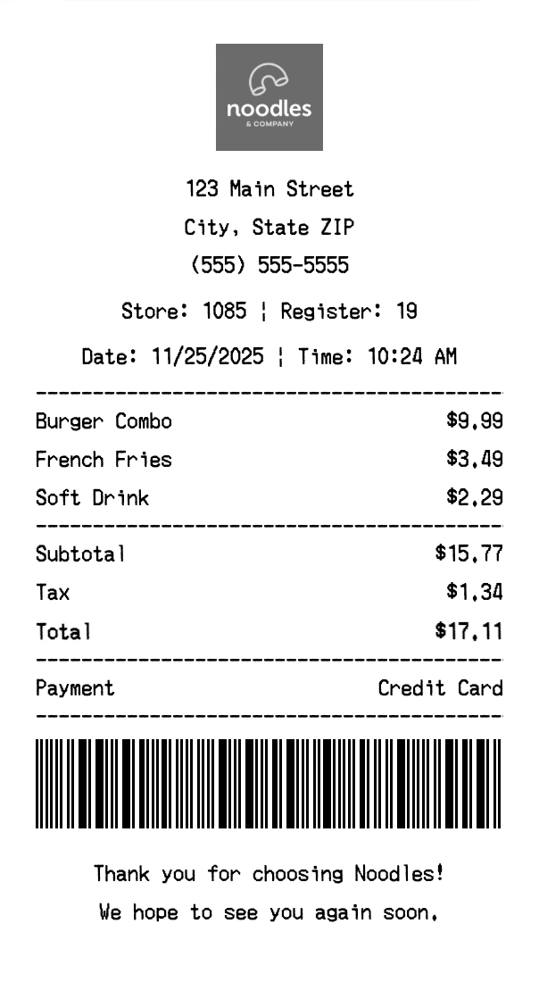 Create authentic Noodles receipts for fast casual purchases. Our free receipt generator tool helps you create professional, detailed receipts instantly. Perfect for business expense tracking, reimbursement requests, and personal documentation. Download high-quality PNG receipts in seconds, no signup required.