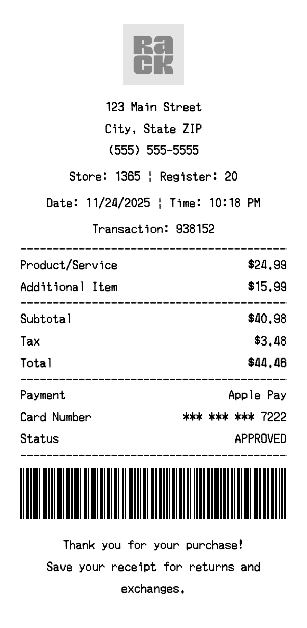 Create authentic Nordstrom Rack receipts for discount retail purchases. Our free receipt generator tool helps you create professional, detailed receipts instantly. Perfect for business expense tracking, reimbursement requests, and personal documentation. Download high-quality PNG receipts in seconds, no signup required.