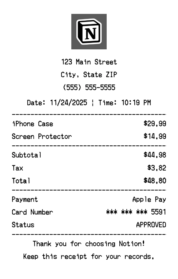 Create authentic Notion receipts instantly. Our free receipt generator produces professional technology receipts with company logo, itemized purchases, tax calculations, and payment details. Perfect for expense tracking, reimbursement, and documentation. Download high-quality PNG receipts in seconds.