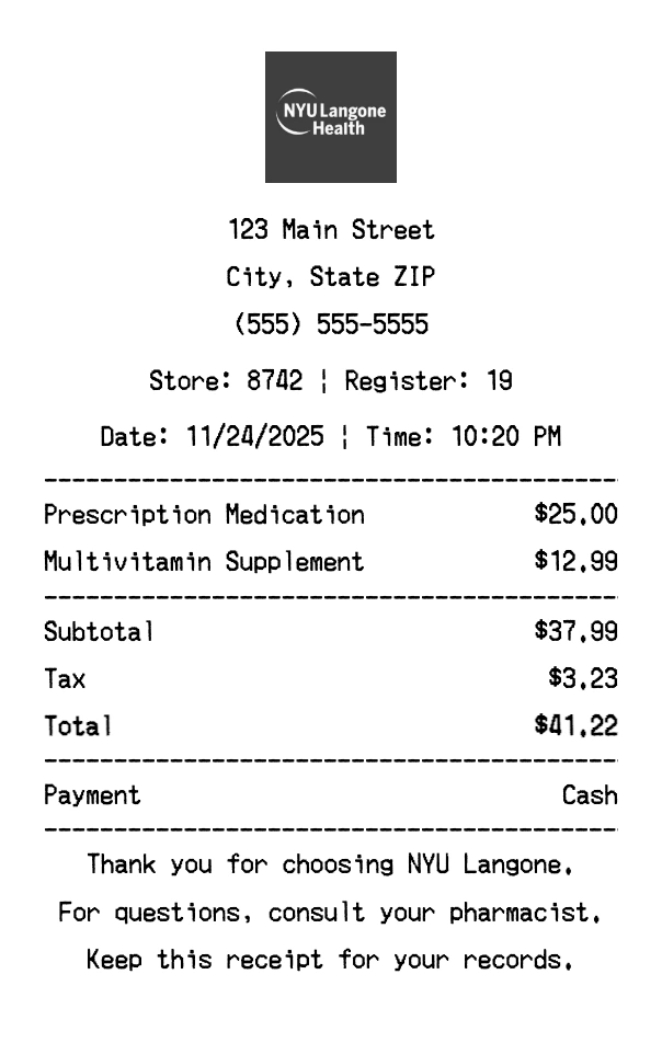 Create authentic NYU Langone receipts for healthcare purchases. Our free receipt generator tool helps you create professional, detailed receipts instantly. Perfect for business expense tracking, reimbursement requests, and personal documentation. Download high-quality PNG receipts in seconds, no signup required.