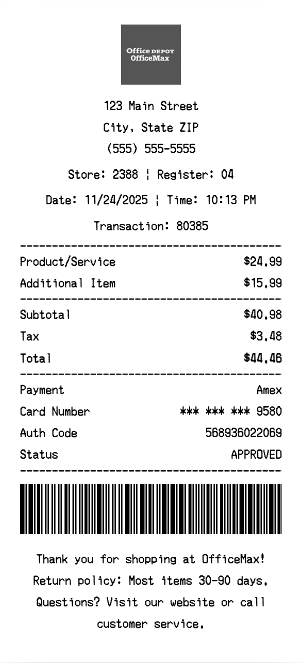 Our OfficeMax receipt generator creates professional receipts that match the authentic OfficeMax format. Each receipt includes the company logo, business information, transaction details, itemized purchase list, tax calculations, and payment information. All receipts are formatted to look exactly like real OfficeMax receipts, making them perfect for expense reports, tax documentation, and reimbursement purposes.