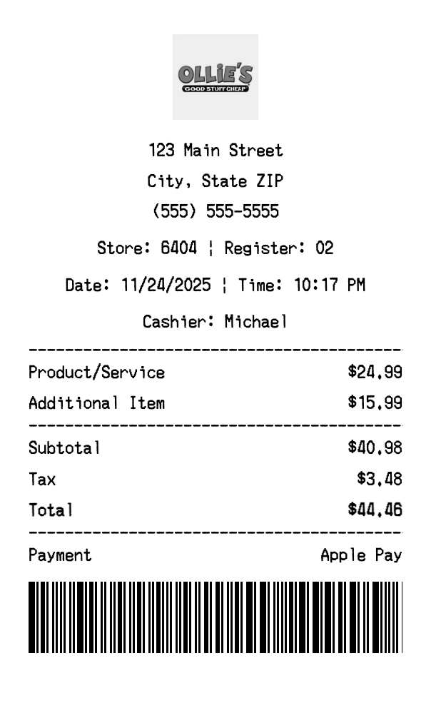 Use our free Ollie's Bargain Outlet Receipt Maker to create professional receipts in seconds.