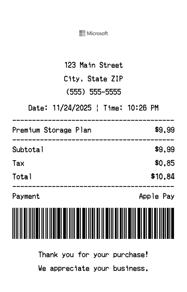 Create authentic OneDrive receipts for cloud storage purchases. Our free receipt generator tool helps you create professional, detailed receipts instantly. Perfect for business expense tracking, reimbursement requests, and personal documentation. Download high-quality PNG receipts in seconds, no signup required.