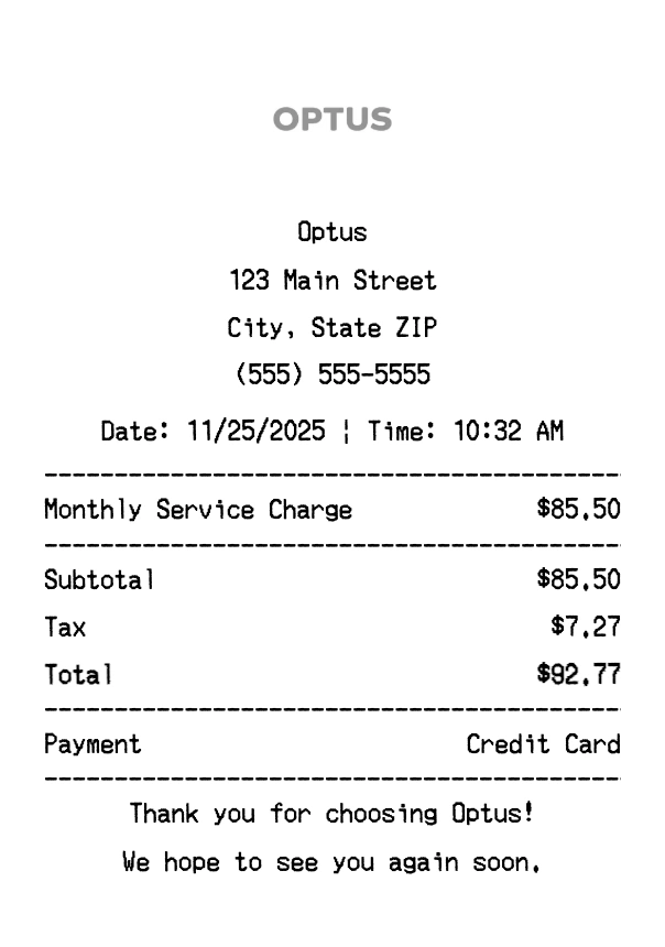 Create authentic Optus receipts instantly. Our free receipt generator produces professional telecommunications receipts with company logo, itemized purchases, tax calculations, and payment details. Perfect for expense tracking, reimbursement, and documentation. Download high-quality PNG receipts in seconds.