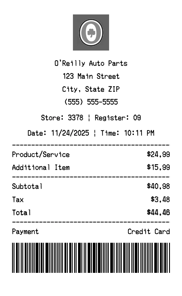 Create authentic O'Reilly Auto Parts receipts for automotive parts purchases. Our free receipt generator tool helps you create professional, detailed receipts instantly. Perfect for business expense tracking, reimbursement requests, and personal documentation. Download high-quality PNG receipts in seconds, no signup required.