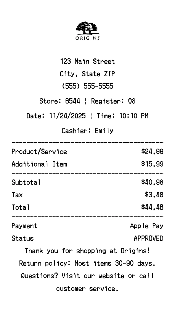 Create authentic Origins receipts instantly. Our free receipt generator produces professional beauty receipts with company logo, itemized purchases, tax calculations, and payment details. Perfect for expense tracking, reimbursement, and documentation. Download high-quality PNG receipts in seconds.