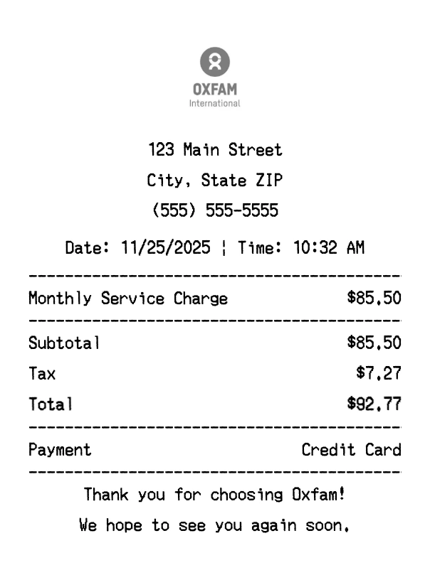 Create authentic Oxfam receipts instantly. Our free receipt generator produces professional charity receipts with company logo, itemized purchases, tax calculations, and payment details. Perfect for expense tracking, reimbursement, and documentation. Download high-quality PNG receipts in seconds.