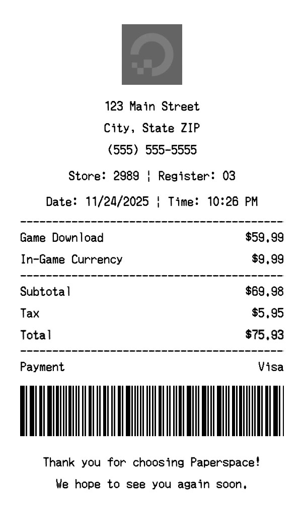 Create authentic Paperspace receipts instantly. Our free receipt generator produces professional gaming receipts with company logo, itemized purchases, tax calculations, and payment details. Perfect for expense tracking, reimbursement, and documentation. Download high-quality PNG receipts in seconds.
