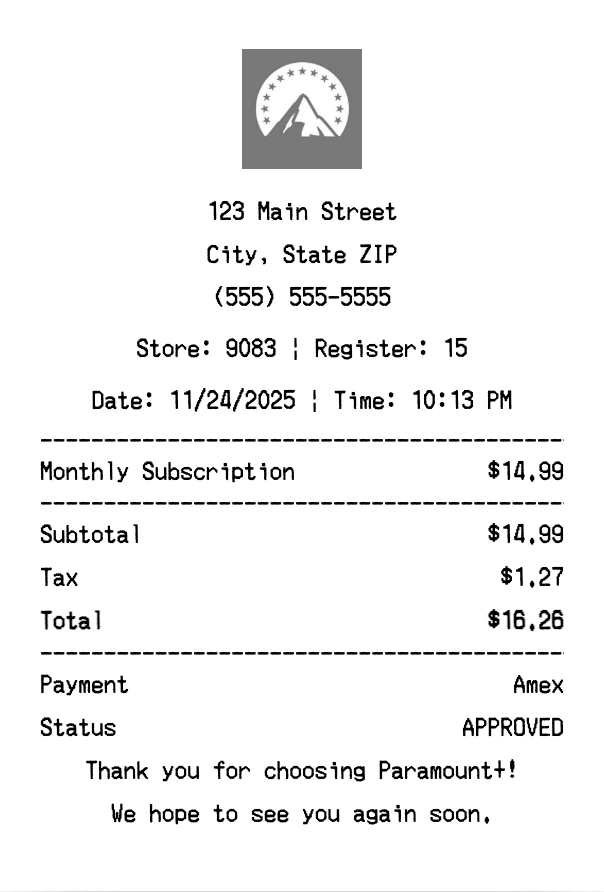 Create authentic Paramount receipts instantly - including Paramount+ (Paramount Plus) streaming subscriptions. Our free receipt generator produces professional streaming receipts with company logo, itemized purchases, tax calculations, and payment details. Perfect for expense tracking, reimbursement, and documentation. Download high-quality PNG receipts in seconds.