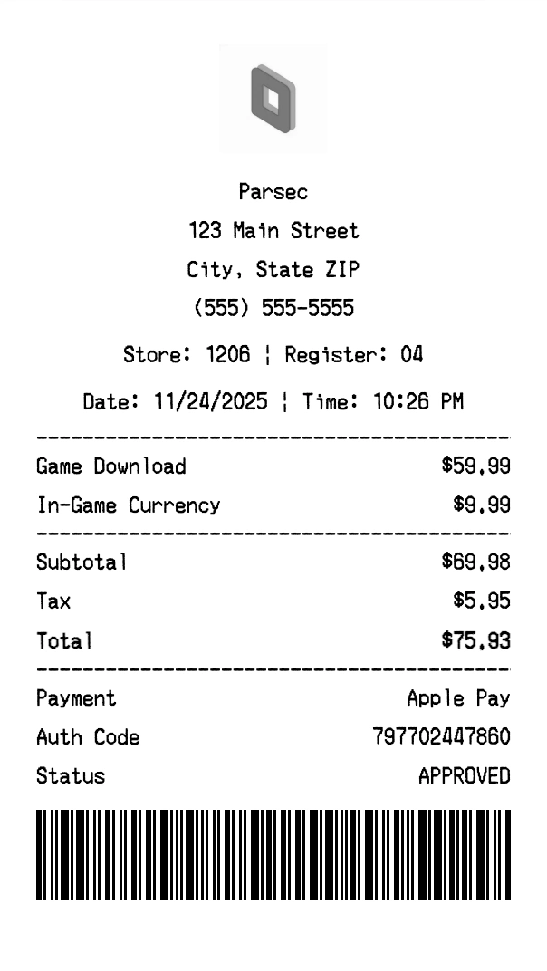 Create authentic Parsec receipts instantly. Our free receipt generator produces professional gaming receipts with company logo, itemized purchases, tax calculations, and payment details. Perfect for expense tracking, reimbursement, and documentation. Download high-quality PNG receipts in seconds.