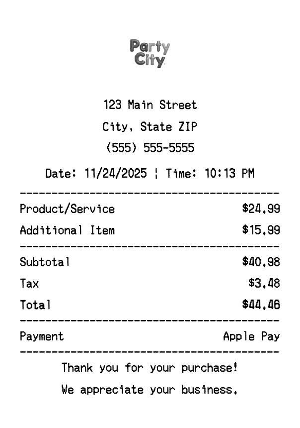Create authentic Party City receipts for party supplies purchases. Our free receipt generator tool helps you create professional, detailed receipts instantly. Perfect for business expense tracking, reimbursement requests, and personal documentation. Download high-quality PNG receipts in seconds, no signup required.