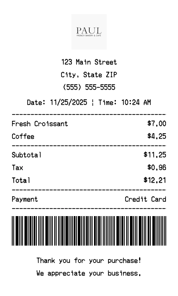 Create authentic Paul receipts for bakery purchases. Our free receipt generator tool helps you create professional, detailed receipts instantly. Perfect for business expense tracking, reimbursement requests, and personal documentation. Download high-quality PNG receipts in seconds, no signup required.