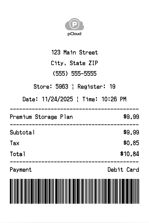 Create authentic pCloud receipts for cloud storage purchases. Our free receipt generator tool helps you create professional, detailed receipts instantly. Perfect for business expense tracking, reimbursement requests, and personal documentation. Download high-quality PNG receipts in seconds, no signup required.