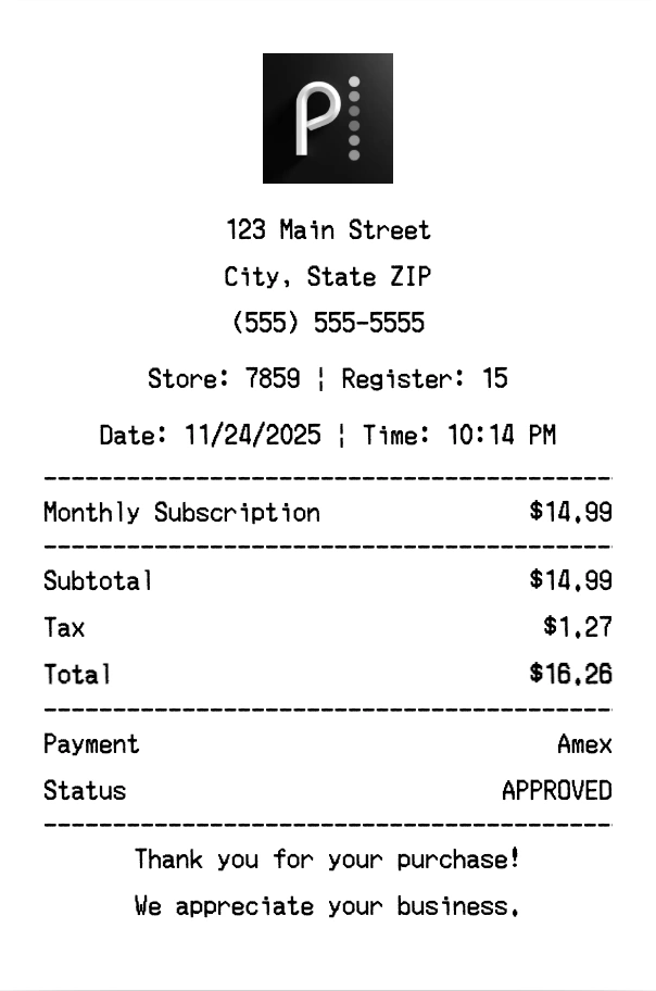 Our Peacock receipt generator creates professional receipts that match the authentic Peacock format. Each receipt includes the company logo, business information, transaction details, itemized purchase list, tax calculations, and payment information. All receipts are formatted to look exactly like real Peacock receipts, making them perfect for expense reports, tax documentation, and reimbursement purposes.