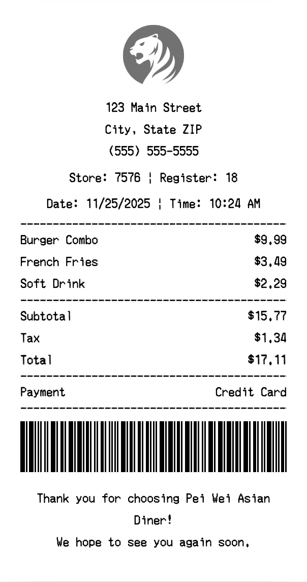 Create authentic Pei Wei Asian Diner receipts for fast casual purchases. Our free receipt generator tool helps you create professional, detailed receipts instantly. Perfect for business expense tracking, reimbursement requests, and personal documentation. Download high-quality PNG receipts in seconds, no signup required.