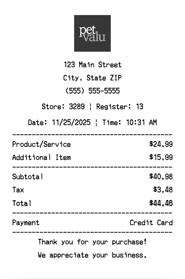 Create authentic Pet Valu US Legacy receipts instantly. Our free receipt generator produces professional pet store receipts with company logo, itemized purchases, tax calculations, and payment details. Perfect for expense tracking, reimbursement, and documentation. Download high-quality PNG receipts in seconds.