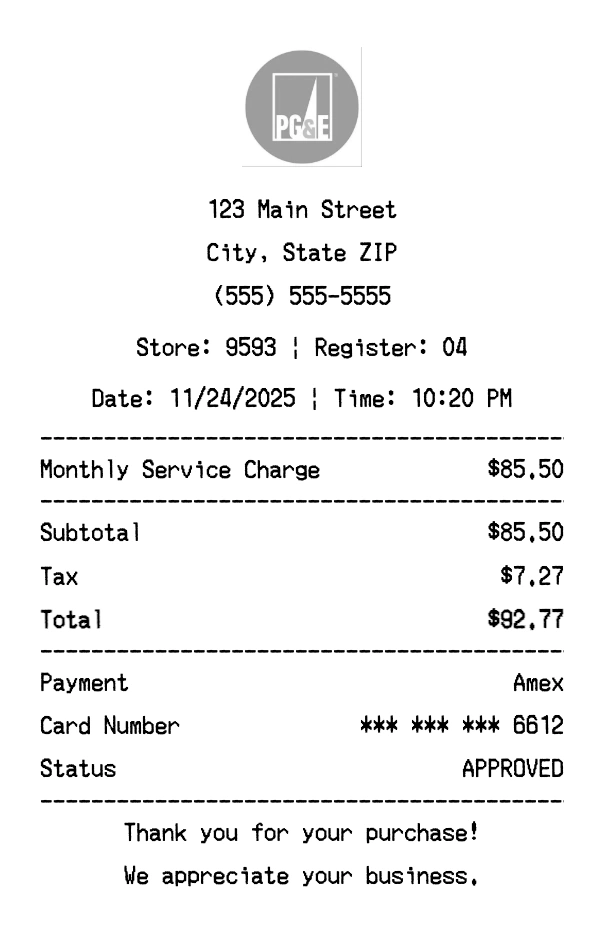 Create authentic PG&E receipts for energy purchases. Our free receipt generator tool helps you create professional, detailed receipts instantly. Perfect for business expense tracking, reimbursement requests, and personal documentation. Download high-quality PNG receipts in seconds, no signup required.