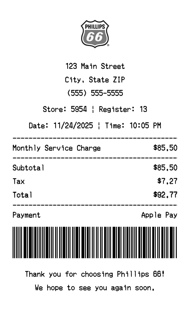 Our Phillips 66 receipt generator creates professional receipts that match the authentic Phillips 66 format. Each receipt includes the company logo, business information, transaction details, itemized purchase list, tax calculations, and payment information. All receipts are formatted to look exactly like real Phillips 66 receipts, making them perfect for expense reports, tax documentation, and reimbursement purposes.