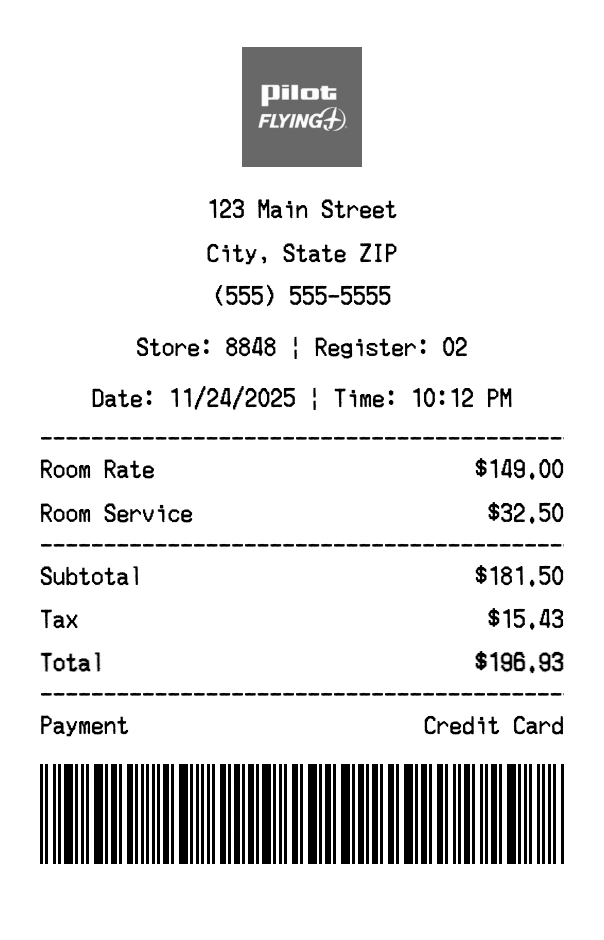Create authentic Pilot Flying J receipts for travel center purchases. Our free receipt generator tool helps you create professional, detailed receipts instantly. Perfect for business expense tracking, reimbursement requests, and personal documentation. Download high-quality PNG receipts in seconds, no signup required.