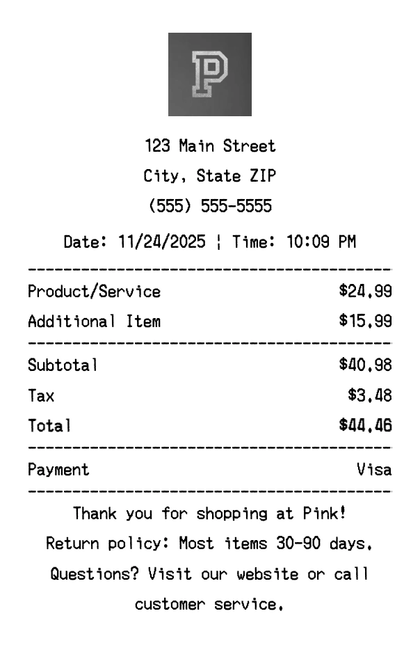 Create authentic Pink receipts for apparel purchases. Our free receipt generator tool helps you create professional, detailed receipts instantly. Perfect for business expense tracking, reimbursement requests, and personal documentation. Download high-quality PNG receipts in seconds, no signup required.