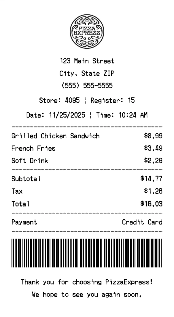 Create authentic PizzaExpress receipts instantly. Our free receipt generator produces professional casual dining receipts with company logo, itemized purchases, tax calculations, and payment details. Perfect for expense tracking, reimbursement, and documentation. Download high-quality PNG receipts in seconds.