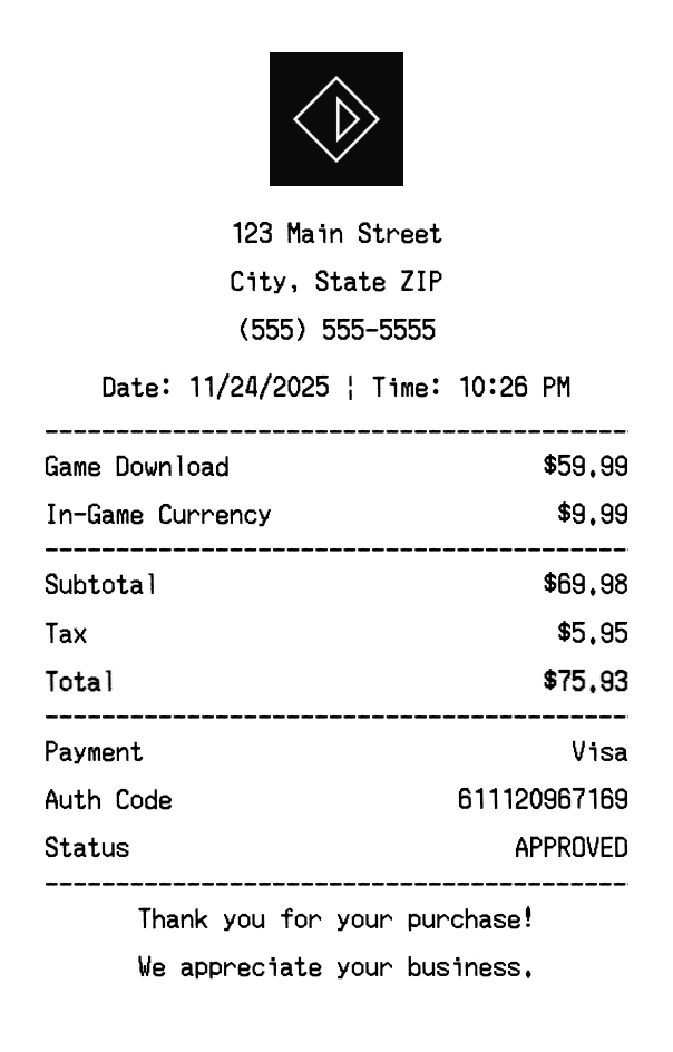 Create authentic Playkey receipts instantly. Our free receipt generator produces professional gaming receipts with company logo, itemized purchases, tax calculations, and payment details. Perfect for expense tracking, reimbursement, and documentation. Download high-quality PNG receipts in seconds.