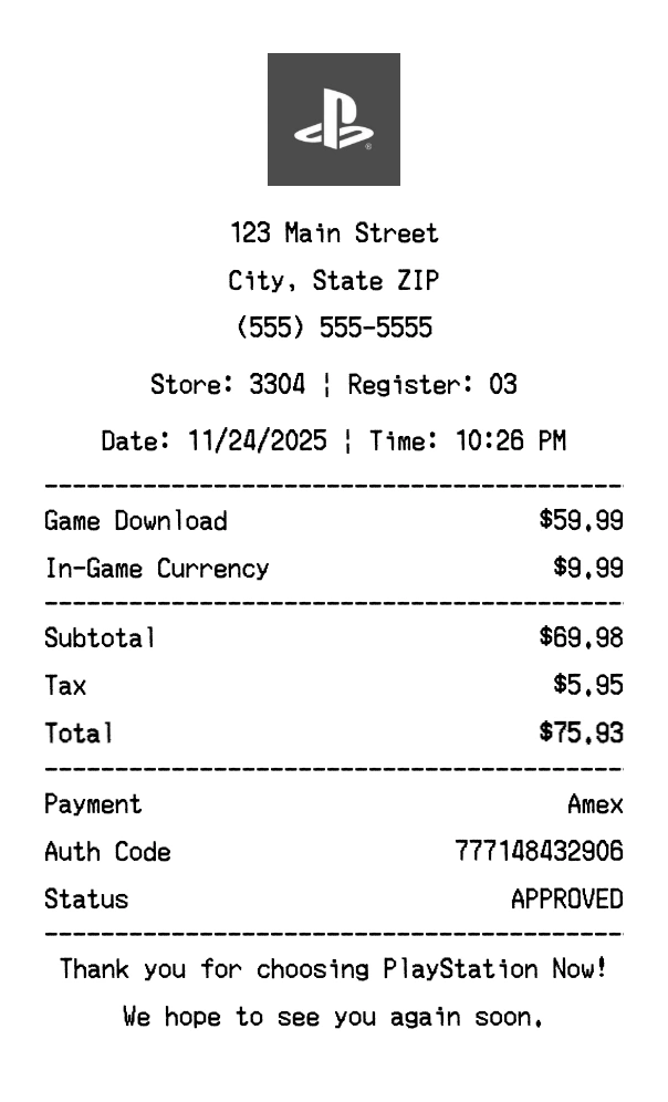 Create authentic PlayStation Now receipts instantly. Our free receipt generator produces professional gaming receipts with company logo, itemized purchases, tax calculations, and payment details. Perfect for expense tracking, reimbursement, and documentation. Download high-quality PNG receipts in seconds.