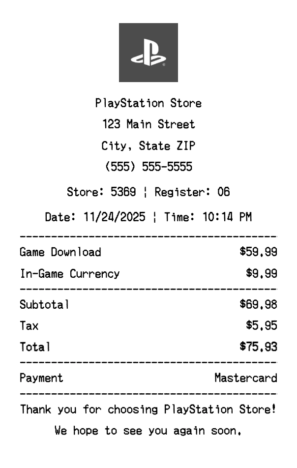 Create authentic PlayStation Store receipts for gaming purchases. Our free receipt generator tool helps you create professional, detailed receipts instantly. Perfect for business expense tracking, reimbursement requests, and personal documentation. Download high-quality PNG receipts in seconds, no signup required.